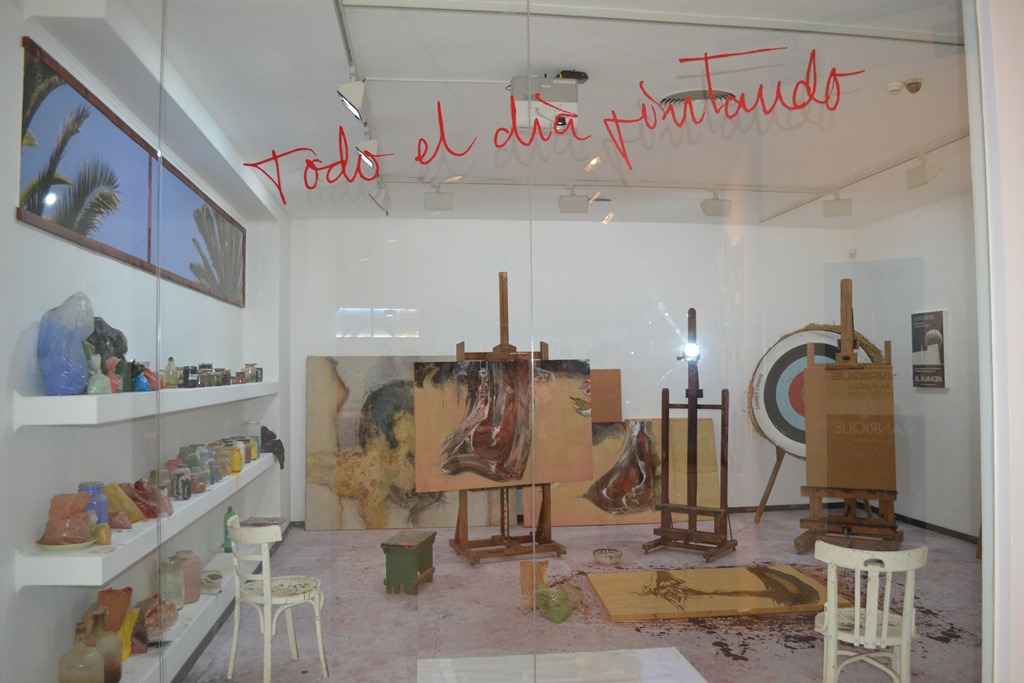 After watching the wind toy craned into position to a round of applause by the media, I entered the exhibition El Taller de los Sueños to be transported into the more private world of Manrique and a reproduction of his studio at home in Haría. There are personal artefacts of paint brushes, shoes, glasses, diaries and notebooks belonging to the artist, the video we featured relating to the BMW 730i series car he painted is playing along with a display of photos relating to the artist over the decades.