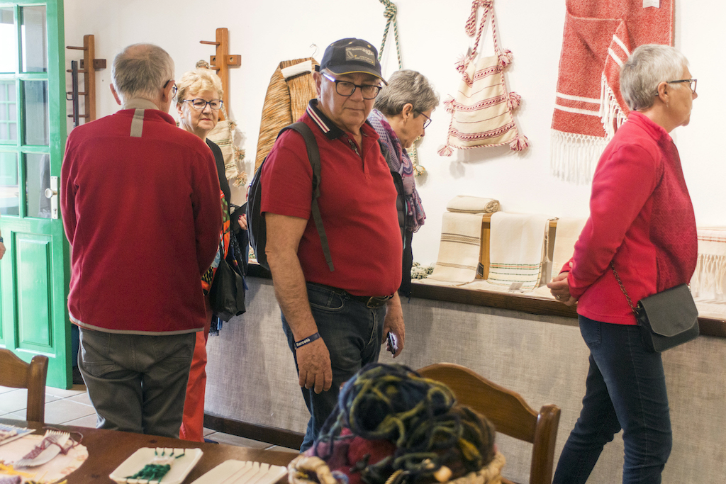 Using a replica of a traditional wooden Canarian loom, that almost fills a room, Montse, head of the weaving workshop shows people how to make a piece of cloth.