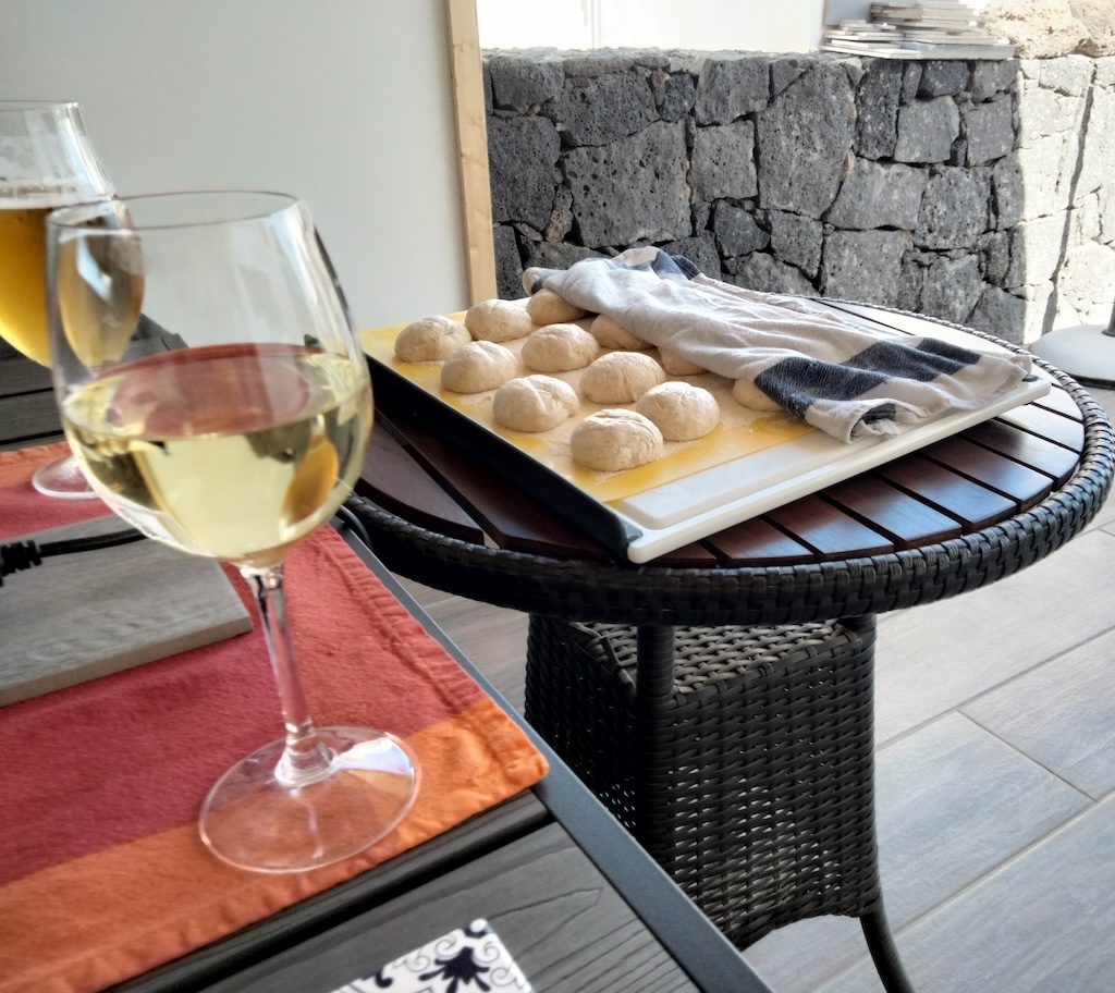 Because we had been asked to bring any favourite ingredients we would like on a pizza I had a bag of apples, pears and bananas (which I usually enjoy on a huge plate at a restaurant in Arrecife). Now here I was, slicing the fruit, and my fingers, rolling out the homemade dough Karin had prepared earlier, sprinkling it in tomato salsa, and laying the fruit and tomato grated local cheese, various meats such as ham salami and fish like tuna, mushrooms, onions and fruit like pineapple. All on top of my apples, pears and bananas base !