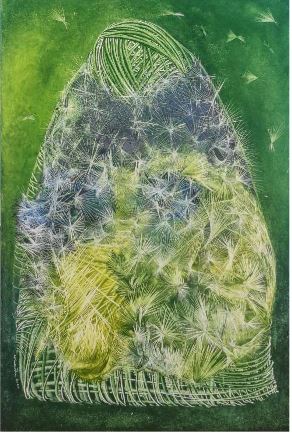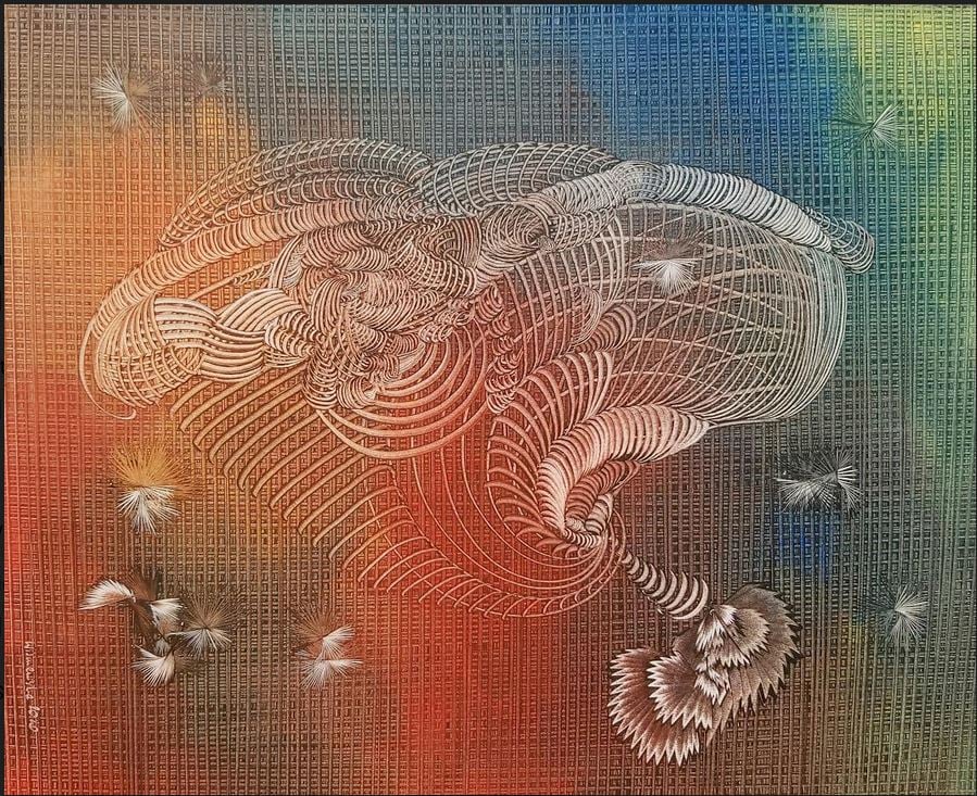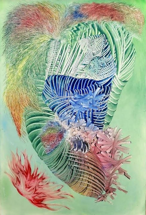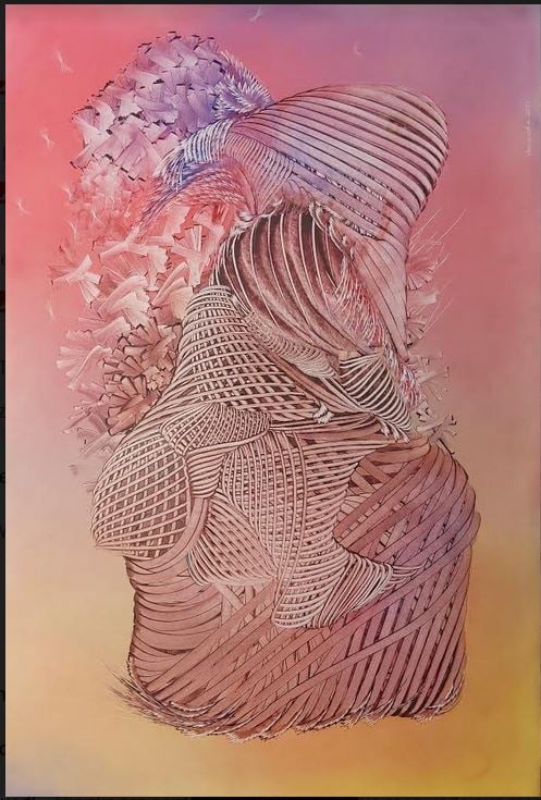 A: I see it as painting “braids”. I crochet my works the way our grandmothers made us sweaters, hats and scarves for the winter or our grandfathers weaved wicker baskets. The technique effects remind me of that traditional activities and I feel some form of connections with my ancestors. I braid these emotions and fleeting everyday sensations into my images.