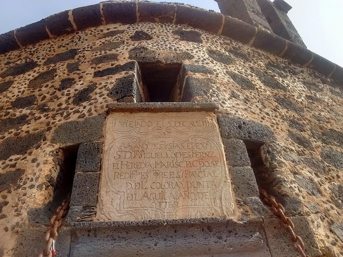 “During the Kingdom of D. Carlos III and under the command of Sir Miguel López Fernández de Heredia Marsical de Campo, this tower was rebuilt in San Marcial, Pto. de Las Coloradas, Punta del Águila in the year 1769”.
