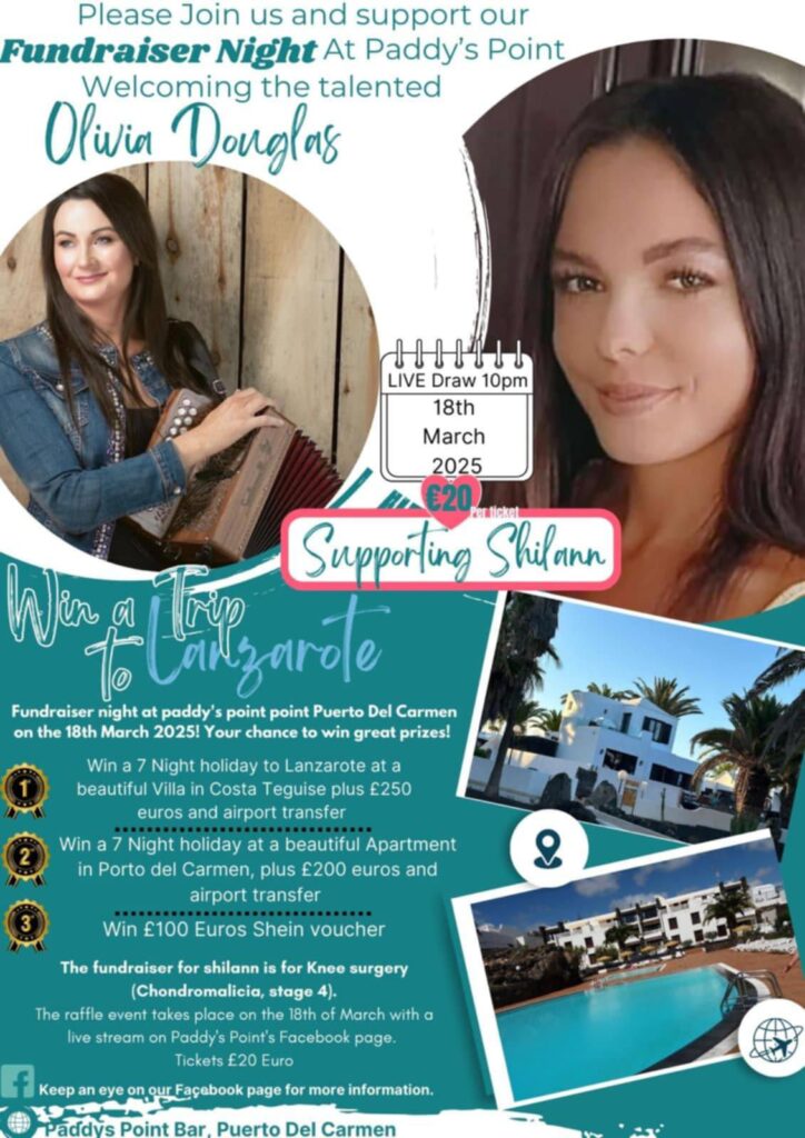 To make that possible there will be a Fundraiser Night on the 18th of March at Paddy’s Point in Puerto del Carmen, Lanzarote. The funds will be raised from a raffle. There will be also a special guest, multi-award winning singer and accordionist Olivia Douglas from Ireland, who will be performing that night. The winners of the raffle will be announced live on Paddy’s Point Facebook page (Facebook) at 10pm that night.