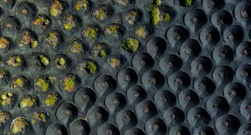 “On the volcanic island of Lanzarote in the Canary Islands, farmers have managed to produce one of the most recognized wines in Spain, due to the strong prevailing winds and to collect the maximum amount of moisture, they make circular holes in the volcanic soil to protect the vineyards.”