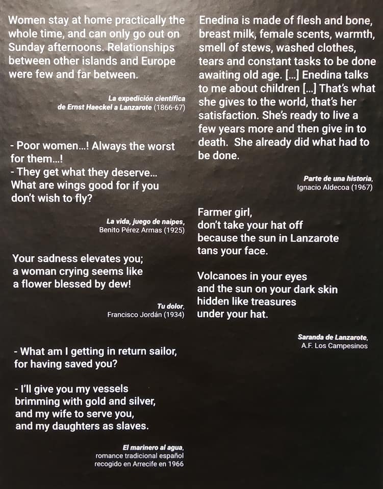 This exhibition combines an informative side with an artistic one, its goal is to make visible and give value to the role of women in Lanzarote’s society. A role that was often anonymous but essential for the survival in such a hostile island with strong hours of sunshine, constant wind and lack of water.