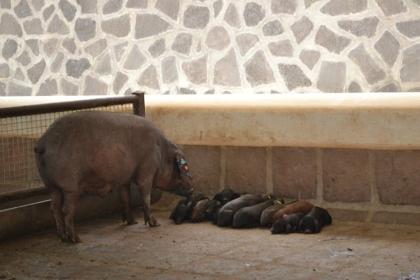Apart from the dairy herd, Finca de Uga also has a livestock of Canarian and Iberian black pigs. Their enclosures include large water features, which the pigs enjoy lying in or creating mud to roll in. The Cochino Negro Canario is more black and fluffy haired than the Iberian breed, which was especially notable in the piglets who were brown in comparison. The farm’s breeding programme includes mating the two varieties to create a perfect pig with the best features of both breeds.