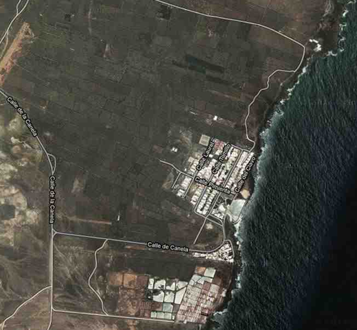 These satellite images show the location of the cueva del agua / jameos, in the first one you can see the saltpans and village, the jameos is in the top right hand corner, the second image is zoomed in on the jameos which is the circular hole just below the centre of the picture.