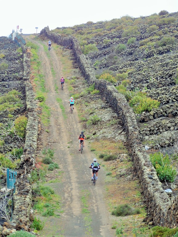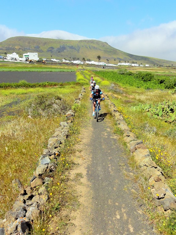 From the Aloe Vera farm, the path zig zags up the hill until meeting the road further up the climb, stay on the tarmac ignoring the first footpath on the right, you’re looking for the second track which is the access road for some houses, just opposite a small white building on the left. This track climbs steeply up towards the “castle house” by La Corona. Follow the track left when it splits so that you join the main road from Yé to Arrieta and enjoy the brief smooth downhill ride on tarmac to exit straight on at the corner, picking up the track to Máguez. The footpath climbs through fairly deep picón around La Corona before dropping through the fields into the village of Máguez, which was a lovely downhill section after all the climbing.