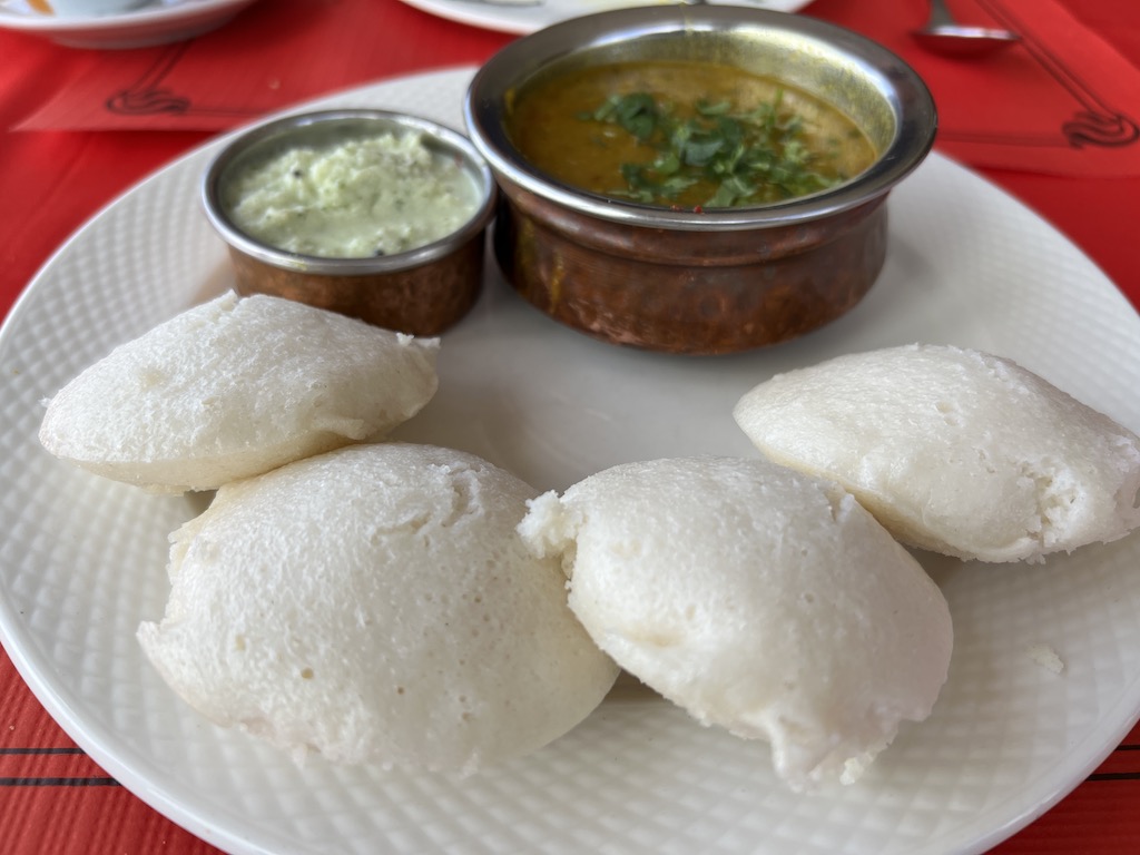 These are steamed bread cakes and are served with Sambar, a lentil curry, and a coconut chutney. The cakes were so unusual, almost like dumplings, and they married perfectly with the sauce and chutney. Very filling!
