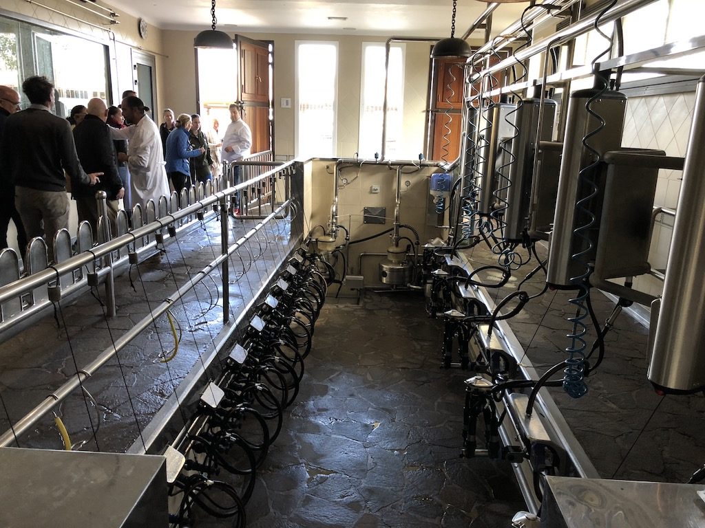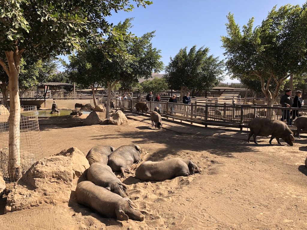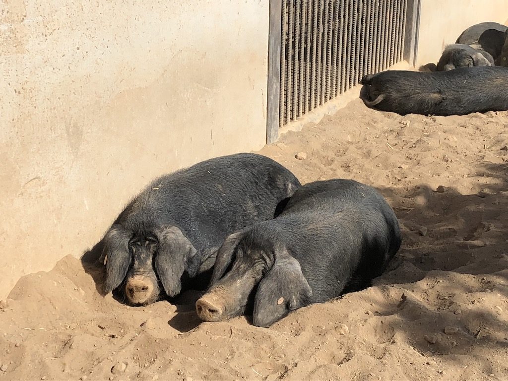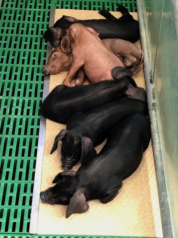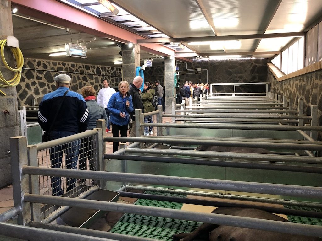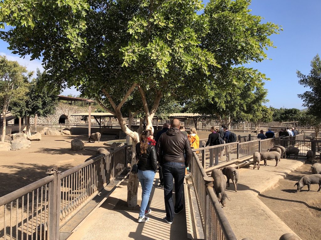 We walked through the large landscaped pig pens, which are planted to provide natural shade, each with a water feature, rain shower and fresh drinking water. Paco was happy to answer everyone’s questions. We discovered that their sows generally produce 3 litters within 2 years. When they are ready to mate, a male is introduced into a group of 25 female pigs for a couple of days. The length of gestation in a swine is the rule of threes: three months, three weeks and three days, for a total of 114 days.