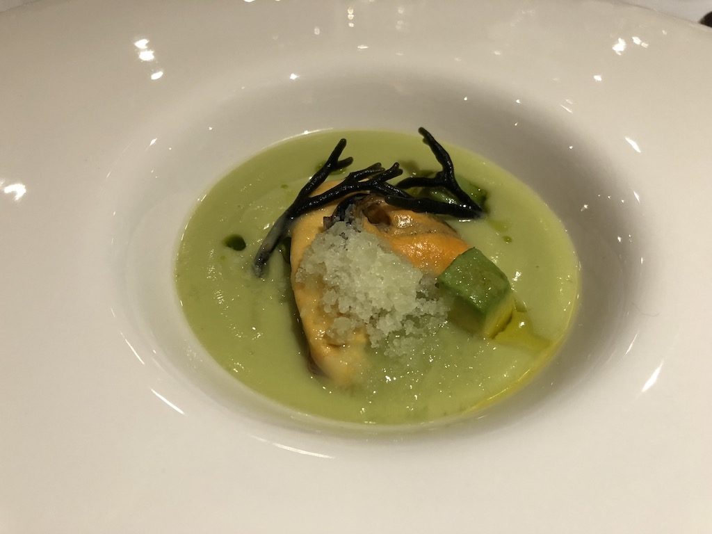 Avocado Gazpacho with Steamed Mussel in Malvasia Wine and Iced Cucumber