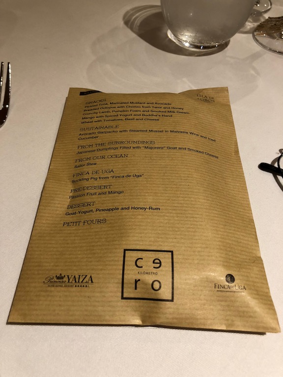 Our menu for the evening was printed on an envelope which contained a gift of blue cheese from the Finca de Uga.