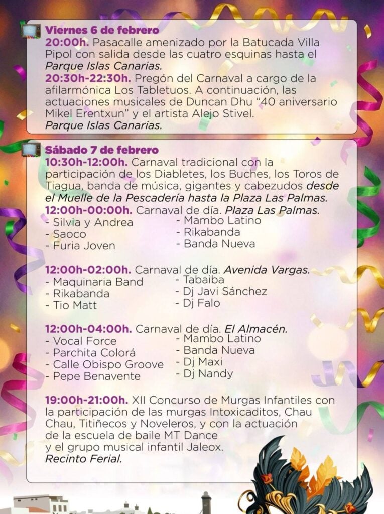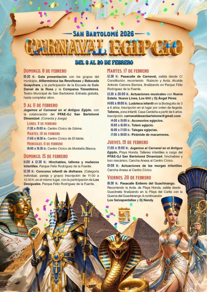 Egypt is the carnival theme for San Bartolomé including Playa Honda. The event will be celebrated in this municipality from 8-20 February 2026. Carnival Tuesday is on the 17th and the traditional burial of the red snapper on the 20th.