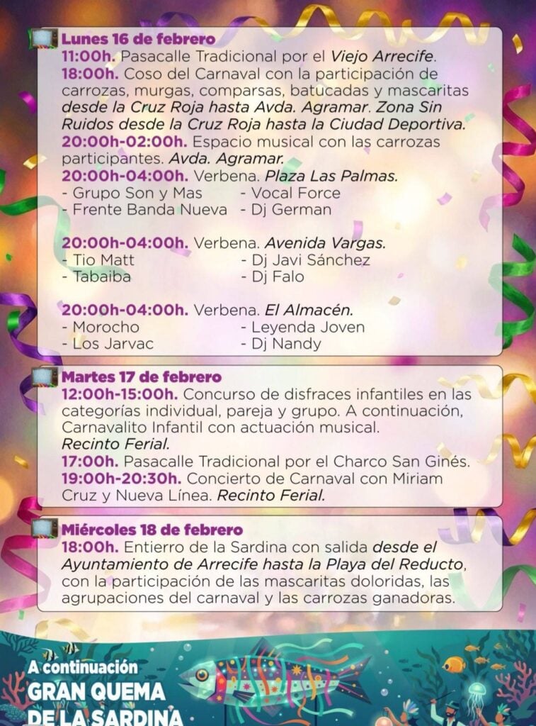 Saturday 14 February is the Carnival Day. There’s a procession at 12.00 from the Parque Islas Canarias along the front to the Ayuntamiento de Arrecife building. Different venues in the capital will have live performances throughout the afternoon and evening, see the programme below for more details.