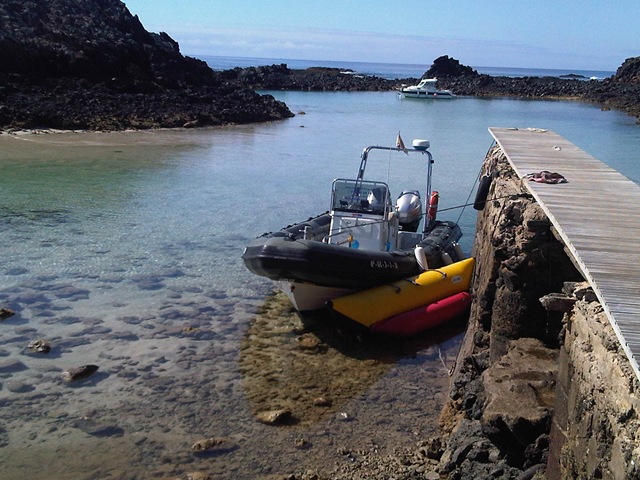 We took a day trip to the island with Oscar from Rubicón Fishing, he takes parties of up to 12 people from Lanzarote to Lobos. We departed from Marina Rubicón in Playa Blanca at 09:30 to cross the 8km La Bocaina channel which separates Lanzarote from Fuerteventura. The crossing was smooth and it wasn’t long before we were cruising into the lagoon of El Puertito (small cute port). The water here was amazing, cristal clear and turquoise blue, when we arrived the tide was low and the no depth at all, Oscar explained there is a large tidal difference which is why the mooring pier was way above our heads!