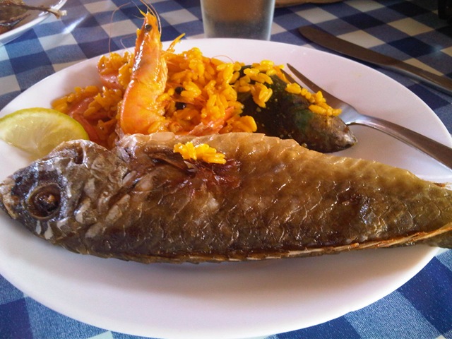 The menu consists of fresh fish or paella, Oscar had phoned ahead to order both for our party which was served as we were seated. We didn’t touch the bowl of potatoes, red mojo sauce or bread that accompanied the dishes as we thoroughly enjoyed the large portion of local fish which had been freshly caught that morning and deep fat fried plus the paella stuffed with prawns, mussels and a tangy squeeze of lemon. This fabulous food with wine, soft drinks and coffee was less than €10 per person.