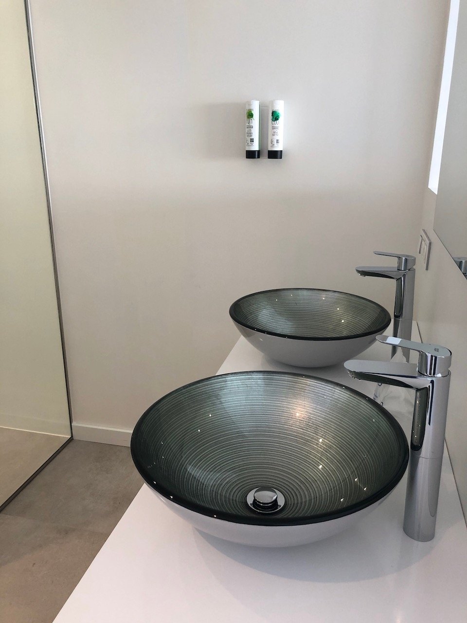 Every room has a sea view, and there are both 55 M2 suites and 40 M2 rooms. We stayed in one of the latter, and it was more than spacious enough. The hotel makes amazing use of glass on the balconies, so you genuinely get a sea view at all times, even from bed! As you’d expect from a five star hotel, the rooms have everything you need from lotions and potions in the bathroom, to a Nespresso machine and a really fabulous rain shower. The fixtures and fittings are really high quality and the flat screen TV is huge. Disappointingly, though, there were only a couple of English language channels available – both news.