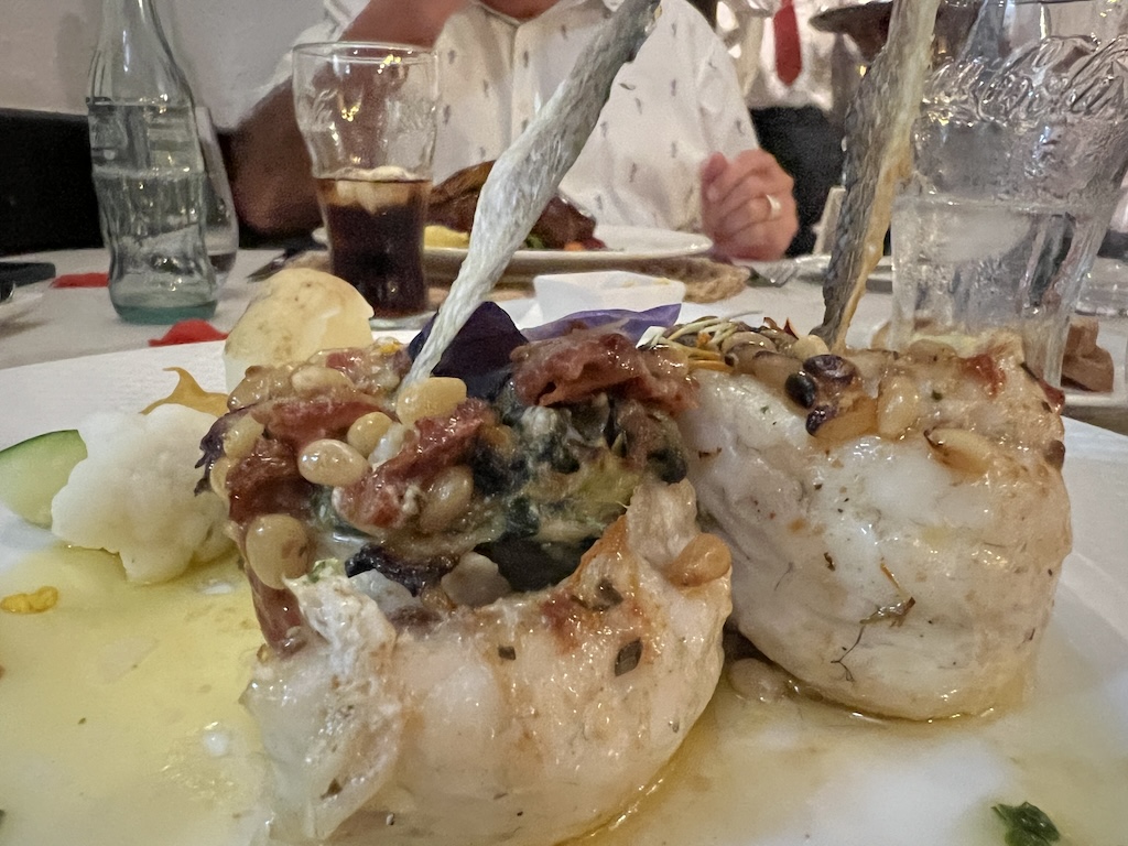 The sea bass was cleverly arranged with filets twisted around a stuffing of pine nuts and tomato vinaigrette. Again, it was too much and Julie could only manage one of the fillets.