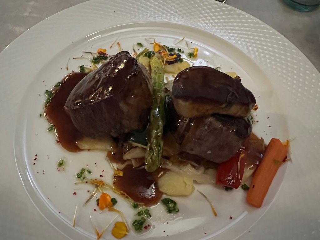 My steaks, and yes, there were two, were fabulous – perfectly cooked, topped with foie, and the sherry sauce was just amazing. The steaks were served with wild asparagus, cooked al dente.