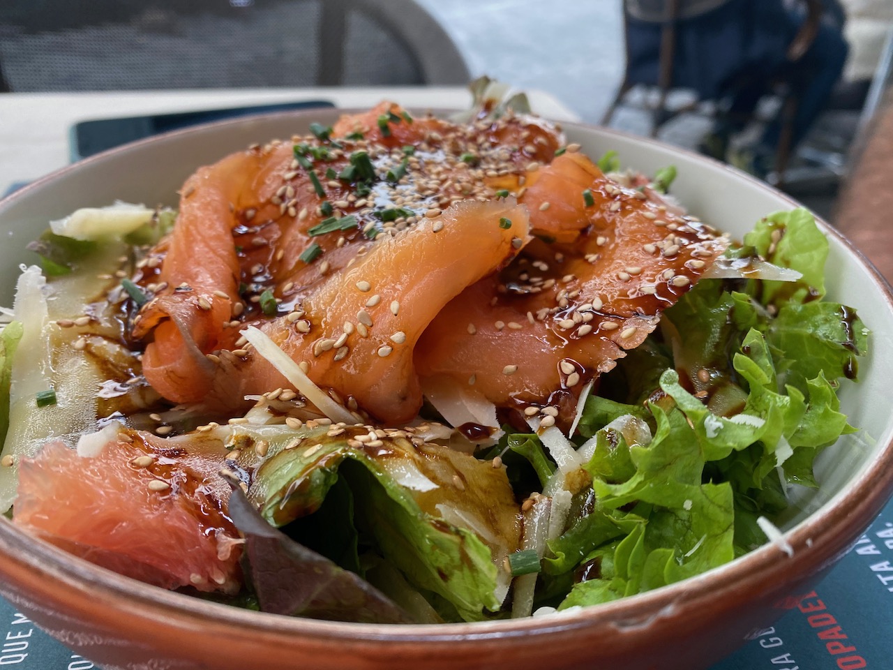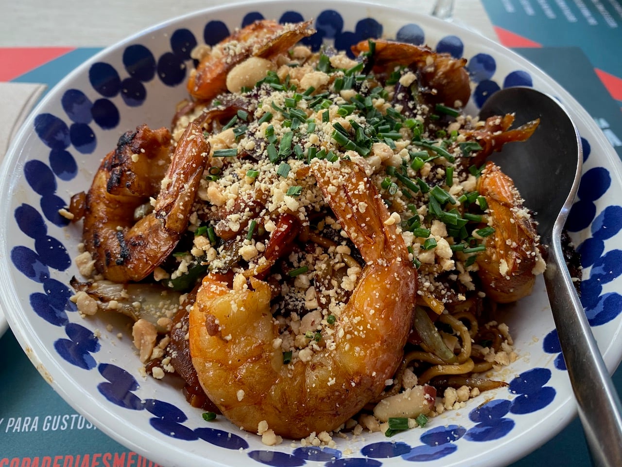 We elected to share two dishes that really caught our eyes – a smoked fish salad and the prawn pad thai wok, and we chose a bottle of Bermejo Blanco seco to enjoy with it.
