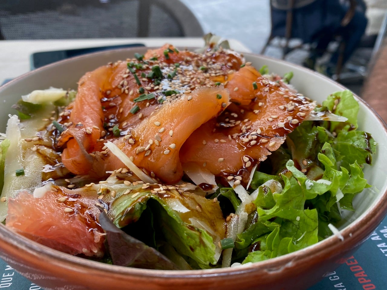 The smoked fish salad was amazing – I wasn’t sure about the citrus flavouring, but the grapefruit perfectly complemented the delicately smoked salmon and the large bowl of salad was topped with pine nuts and a lovely sweet dressing, which I presume was made with citrus juice and honey.