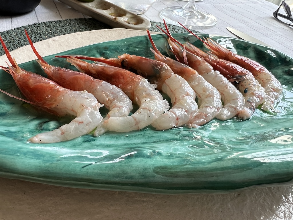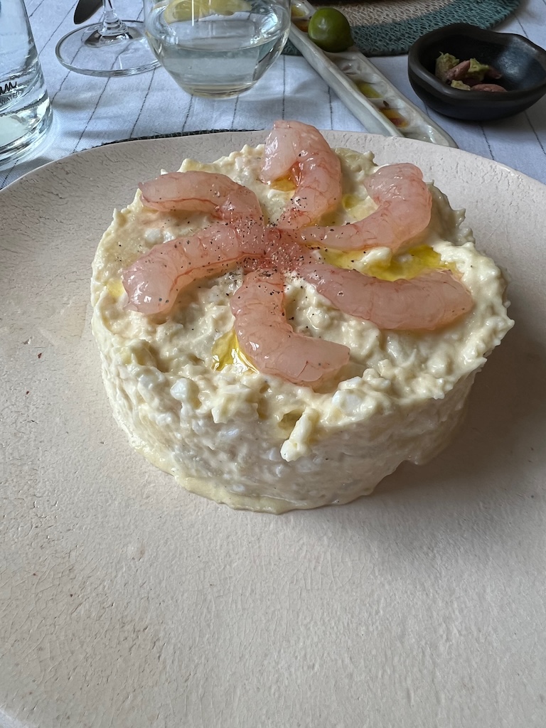 For our starters I went with a salad of La Santa prawns, which consisted of a large portion of a very tasty potato salad topped with the delicious little red prawns. Julie also went for La Santa prawns – they’re a delicacy here and often not available, and hers were served not cooked, but slightly pickled like ceviche, on a plate and they were stunning.