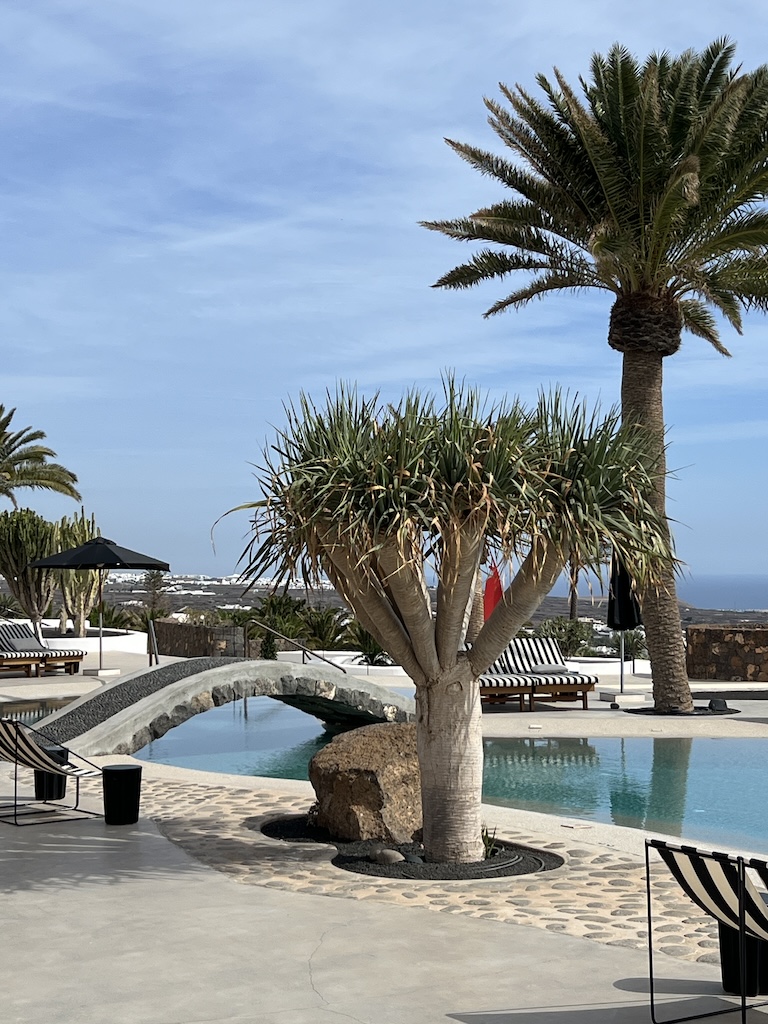 You know you’re somewhere special the moment you pull into the long driveway, with huge iron gates on either side of the entrance. Parking up, you’re surrounded by vines and the views down to Puerto del Carmen, the airport and Arrecife are simply amazing. Walking around to the front, you’re greeted by a huge sun terrace and infinity Manrique style swimming pool, complete with a bridge across it.