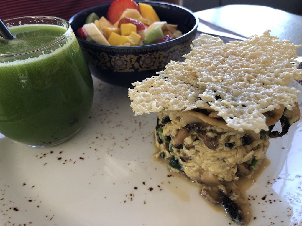 But it arrived eventually, and looked amazing. Julie’s consisted of a smoothie, then yoghurt and fruit, followed by brioche served with salmon avocado and tomato. Mine was a green smoothie, then a fruit bowl, a french omelette and finally French toast with honey and cocoa.