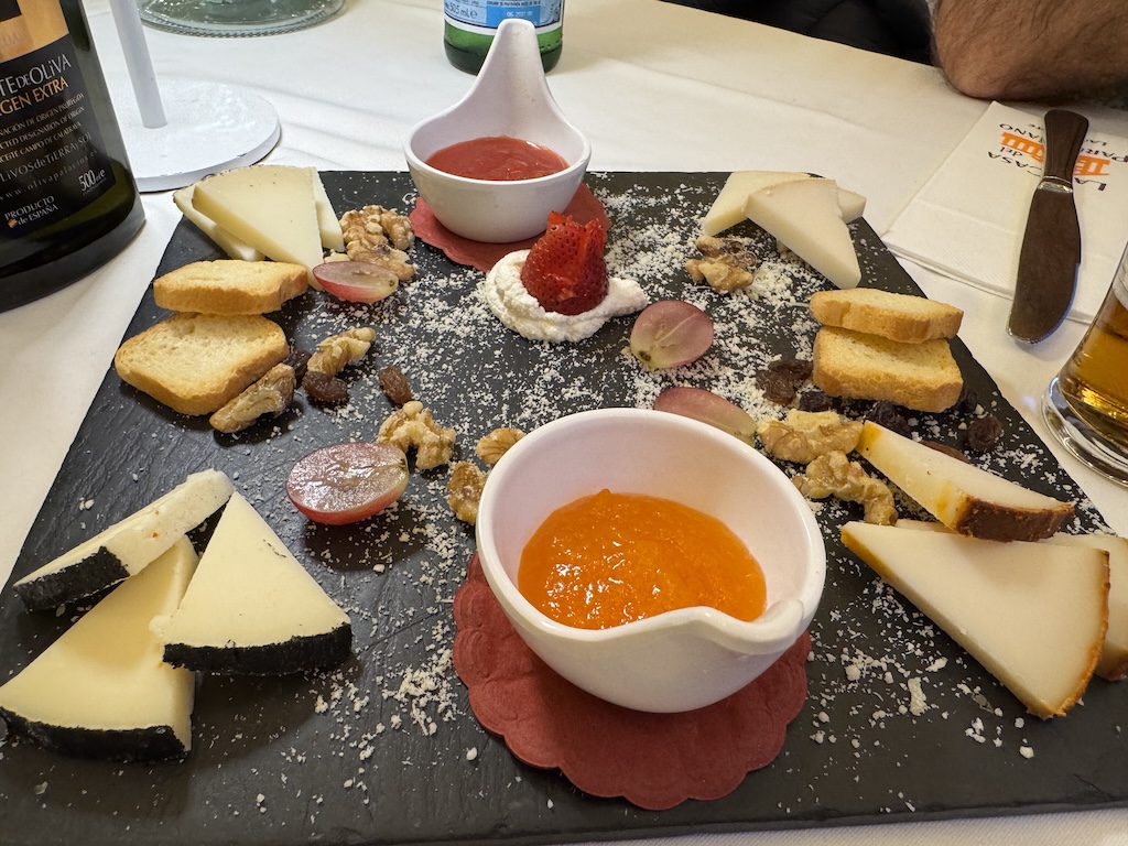 This visit was for a dinner, and we chose to share a platter of Finca de Uga cheeses as a starter. The cheese from the finca deservedly wins awards – it’s fabulous! The platter came with walnuts, grapes and a strawberry in ricotta, and we had four different cheeses to enjoy. Bread arrived, together with a superb olive oil, which was spicy and green.