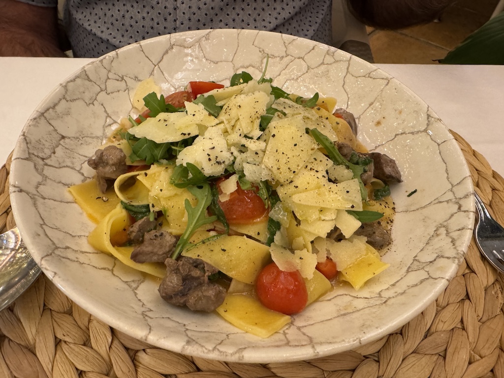 I had home made egg pappardelle, with slices of hot steak, tomatoes and mushrooms. The pasta, as you’d expect, was perfectly cooked, and the dish was filling and tasty. My only complaint was that it could have taken more seasoning, and I added plenty of freshly ground black pepper.