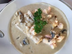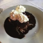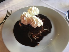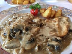My choice was the salad “opera” to start, which was huge! It’s a Waldorf style salad with prawns, celery, apple & walnuts served with a mustard mayonnaise. For my main course I chose the filet of chicken Tosca, the meat was cooked on the plancha and served with a lovely white wine, cream and mushroom sauce, plus a side dish of potatoes.