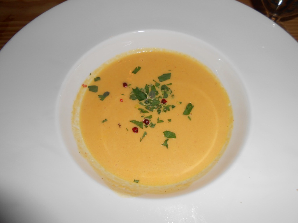 Despite the pressure on the kitchen from all of the diners, our food arrived promptly, the soup was delicious and something we’ll try to recreate at home. Somehow the chef had created a light, creamy and smooth pumpkin soup with a zing of curry which was served with fresh bread and sprinkled with herbs and a couple of red peppercorns. We weren’t disappointed with our main courses, I adored the combination of chick peas dressed with yoghurt, pine nuts and a good portion of rump steak cooked to your preference. Miguel said his dish was extremely tasty with a good sized portion of braising steak, green beans, mashed potato and gravy.