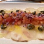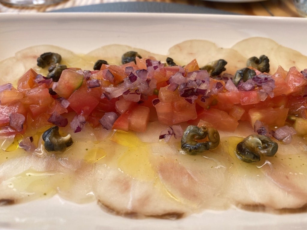 Julie chose a light main, which was a Carpacio of Sama. Wafer thin shavings of raw fish, with an olive oil dressing, and served either side of a “tunnel” of finely chopped tomatoes and onions. It was delicious, but a small portion. To be fair, the waiter had questioned us “Do you want this as a main course?”