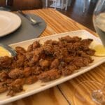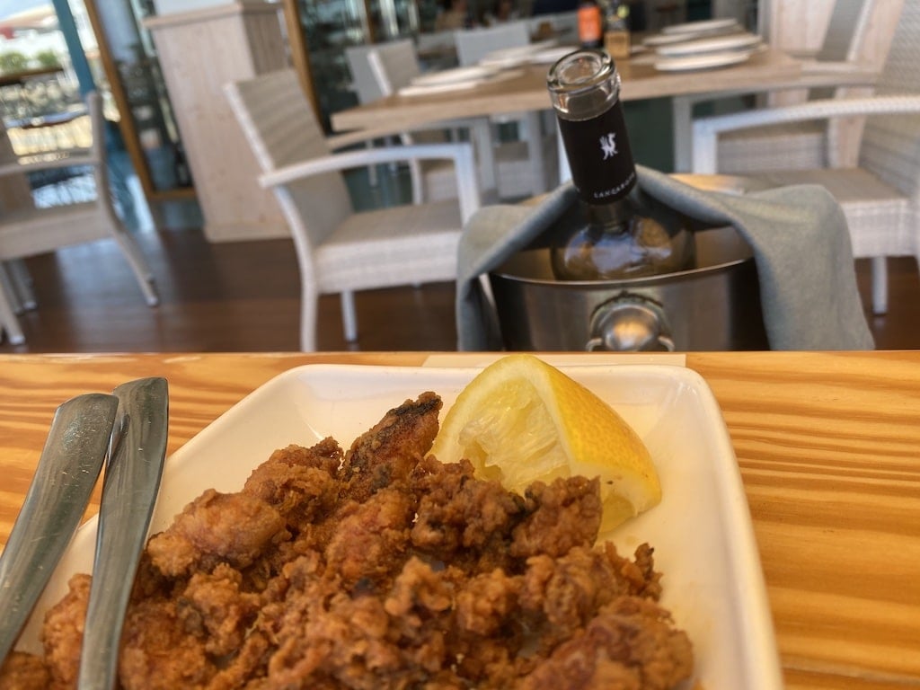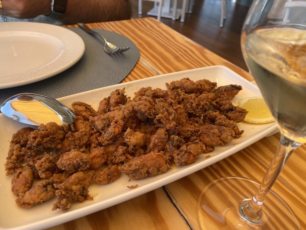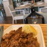 We ordered a bottle of El Grifo’s Collecion Malvasia Seco while we perused the menu. We chose Puntillas as a shared starter and agreed they were the best we’d ever had. These were genuinely small, baby squid, and served in the most delicious, crisp batter. We were off to a fantastic start!