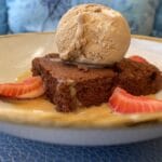 Unusually, we chose to have desserts. I chose a chocolate brownie with Toffee sauce and hazelnut ice cream. The brownie was more like a sponge, and lacked density, but the ice cream and the toffee sauce were amazing. Julie had a semifrio (a home made ice cream) made with mango, served with red fruits and on a passionfruit sauce. Palate cleansing and gorgeous.