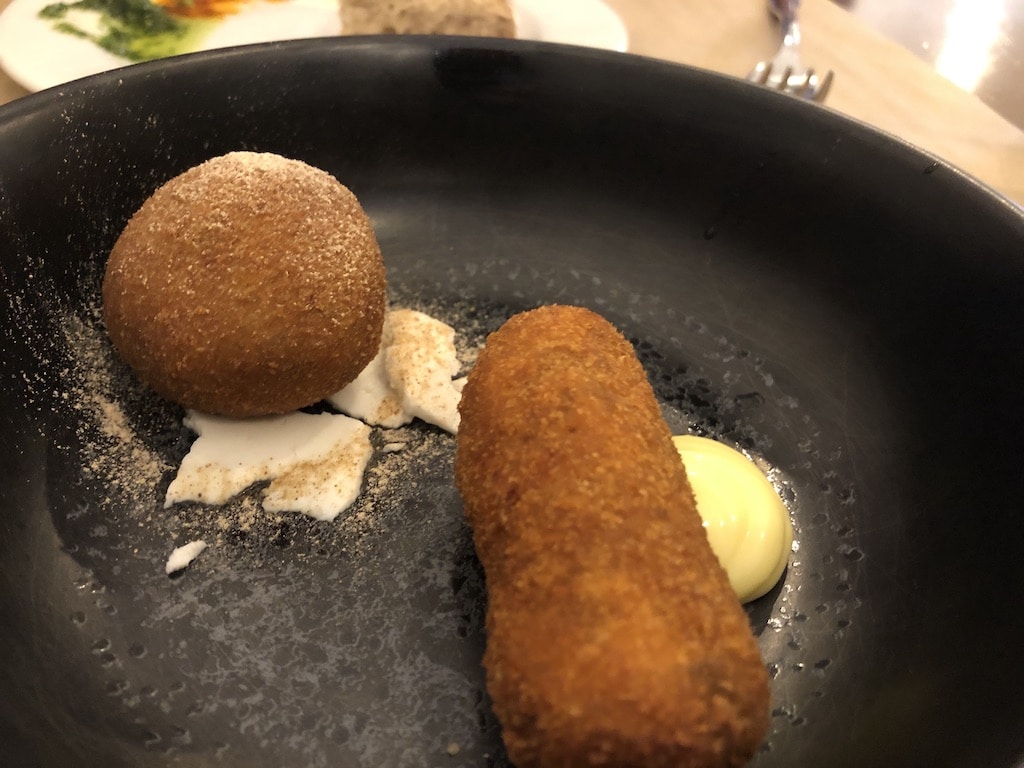Once our bread and wine arrived, the waiter brought us a complimentary tapa, which consisted of two delicious croquettes.