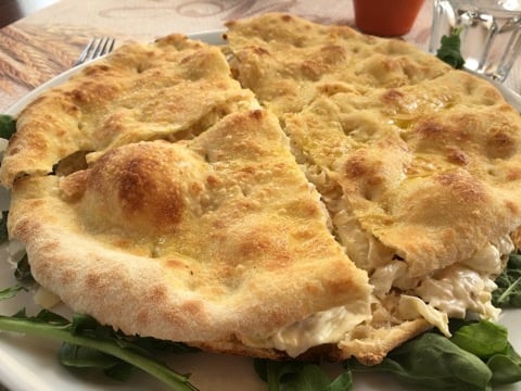 The chicken salad pizza is fabulous! Imagine a light and crispy focaccia bread thinly sliced, with a chicken Caesar salad filling, served on a bed of mixed leaves. It’s a brilliant combination, the chicken is mixed with mayonnaise and has shavings of Parmesan. Priced at €8 it’s great value and big enough to share between two if you want a lighter lunch option.