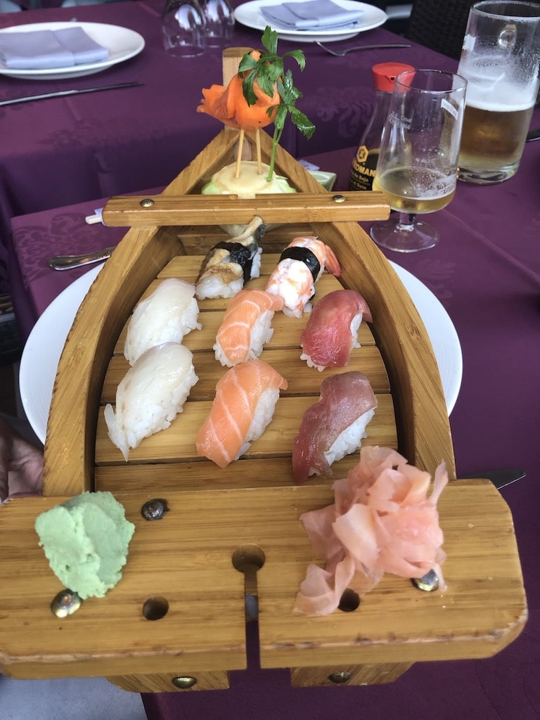 The place is vast, basically a huge open fronted space, right on Puerto del Carmen‘s Avenida. It’s beautifully decorated in the Oriental style, and spotlessly clean. We arrived before our friends, who had booked the table, but we were ushered in for a drink while we waited for them, and were shown to a prime table at the front of the restaurant, from where we would watch a spectacular sunset during the course of the evening. Despite being open fronted, the restaurant has a cracking AC system that keeps everyone cool.