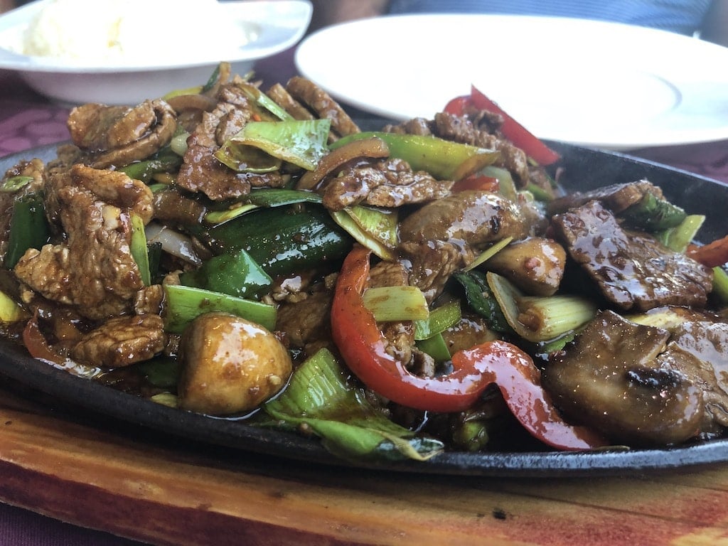 Onto the mains! Highly recommend by my friend Neill, I went for the Mongolian Beef. It was, without question, one of the best Asian dishes I’ve eaten. Strips of fillet steak, perfectly cooked and butter tender, stir fried with vegetables and a sauce that perfectly balanced, sweet, sour, spicy and salty – a genuine show stopper of a dish. Julie went for Yakitori prawns – glazed prawns on a skewer, with a gingery, sweet coating. Again perfectly balanced flavours.
