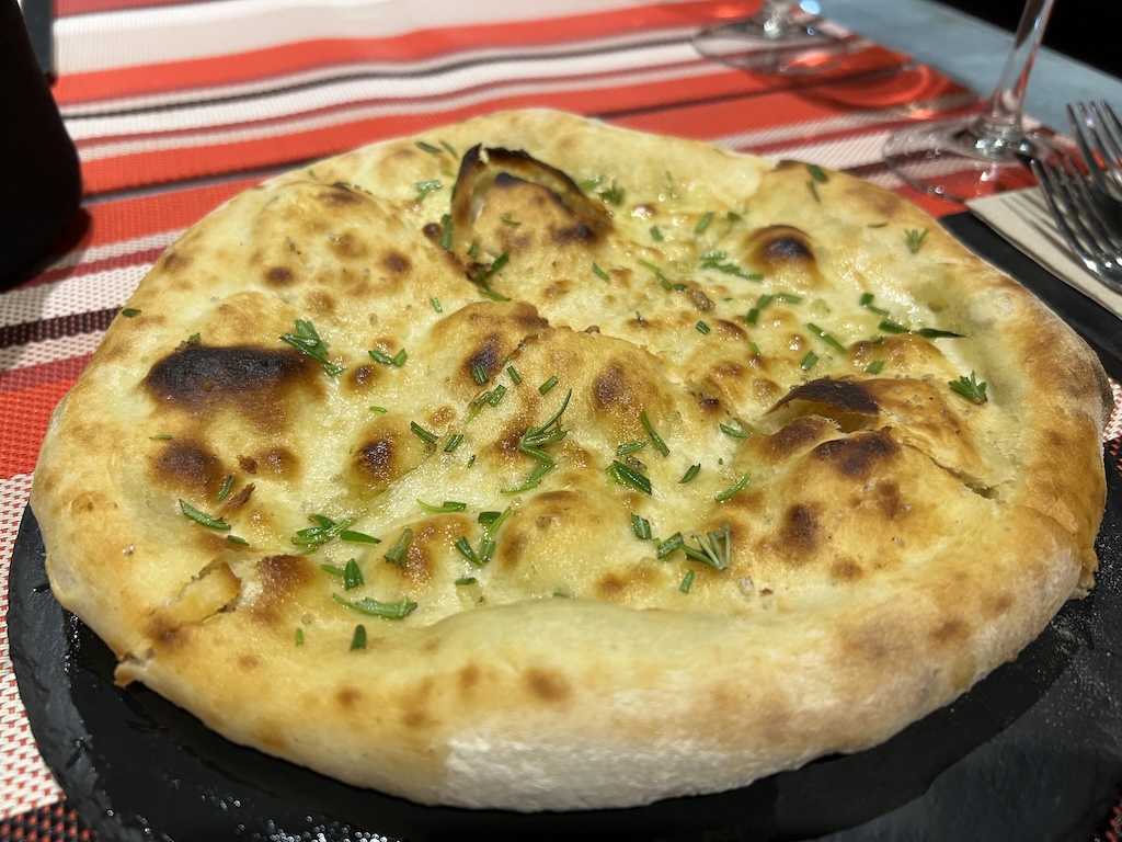 For my starter, I chose garlic prawns and Julie went for garlic and rosemary pizza bread, so we shared both dishes. The pizza bread was fabulous, and perfect for mopping up the prawny oil! The prawns were perfectly cooked – something that isn’t easy to do, as they have to finish off their cooking at the table.