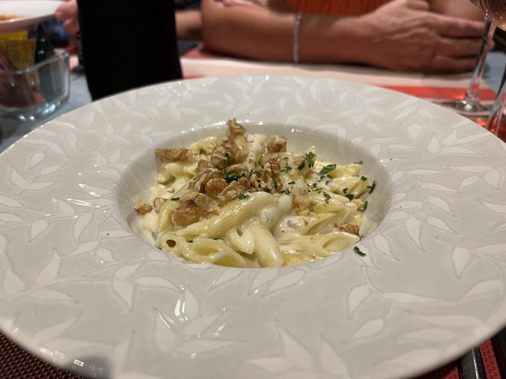 For our main courses, I chose the Penne Arrabiata, which was described as spicy. Nico asked me how hot I’d like it on a scale of 1 to 6. I chose a 6 – most Spanish restaurants don’t make food spicy enough for me, so I went for the hottest, without computing the fact that I was in an Italian place. Julie chose penne pasta as well, hers with a gorgonzola and walnut sauce. The penne was just perfect on both dishes, slightly al dente, as it should be. My sauce was tomato based and super spicy – I loved every mouthful, but I think I’d go for a 4 on the heat next time. Julie’s sauce was rich and very creamy. Sometimes gorgonzola sauces can be overpowering, but this one wasn’t, and the crunchiness of the walnuts worked beautifully with it. Paul had the same as me, and Jill went for the Iberian Pork Tenderloin, which looked absolutely amazing, and was served with a sauce made with roasted peppers, black olives and honey. I did have a little food envy when it arrived, and I’ll be trying it next time I’m there.
