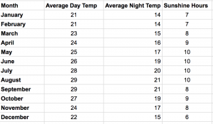 Again this is an average, and it ranges from 14 in January to 21 in August and September. To put that into perspective, in summer here, even in the early hours, it’s often warmer than midday on northern Europe!