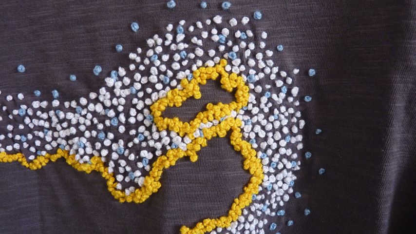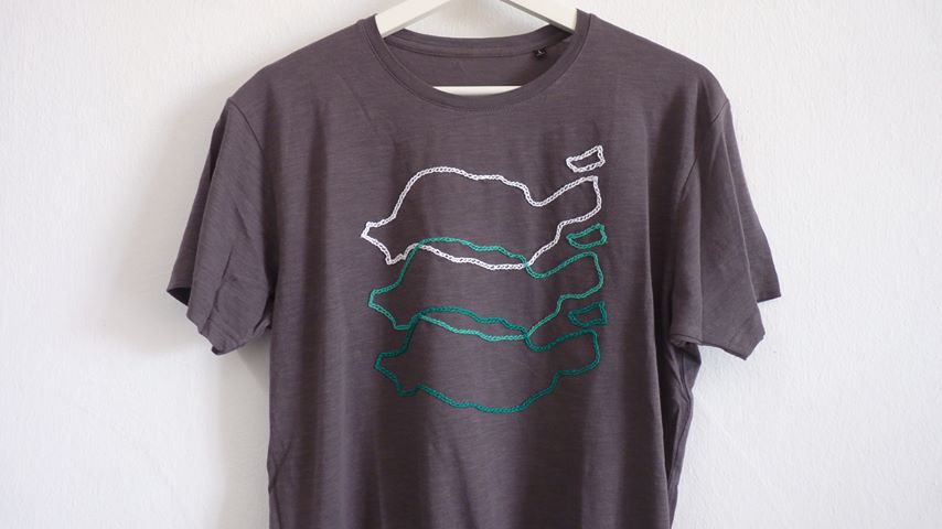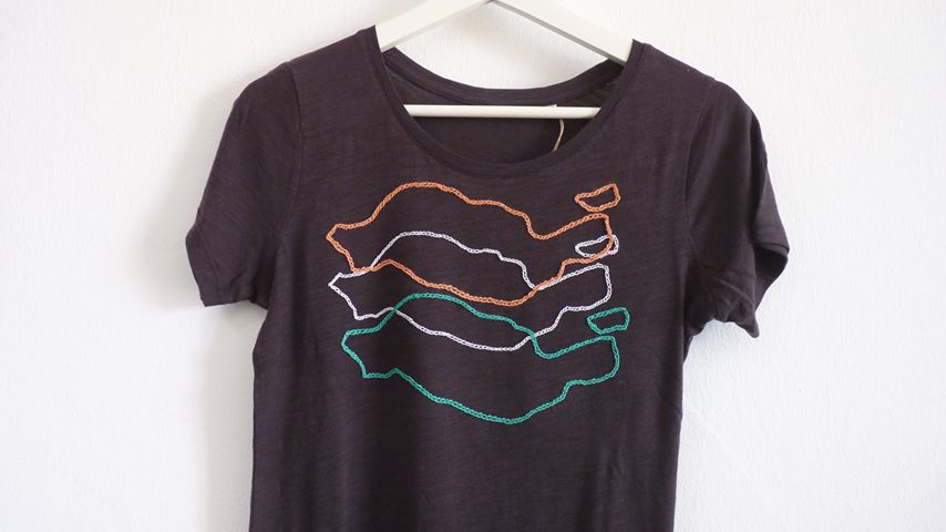 It’s actually two different ecologic cotton t-shirts with the outline of Lanzarote embroidered by hand using different techniques: one using chain stitches and the other one French knots.