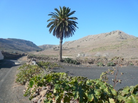 During this climb take a moment to catch your breath and look back down the valley to Haría with Monte Corona in the distance, at the top the trees thin out and there are fields planted with crops, look for the path which continues in the same general direction on the other side of the dirt track. Once through the passage way between the fields you will reach the trees again, follow the wider track now to the right, you are at the boundary of Bosquecillo, take any path through the trees or continue right to the stone wall and take in the view before heading to the left and around.