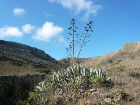 The shorter route is to head left up Calle Angel Guerra, when you reach the school and sports ground continue up the road which becomes a dirt track, this routes takes you past fields and you may see the locals tending their crops and vines. Where the track meets the barranco, you can’t go any further as it is chained off, you need to walk up the barranco and the path is on the left hand side at first swapping to the right later, this is passable but overgrown and you need to take care with the sharp Agave spiky plants and spider webs if you’re the first one through! The banks of the barranco has wild fennel growing and you will get lovely wafts of aniseed as you walk through, eventually this meets the dirt track from the longer route.