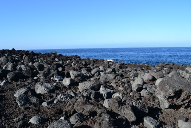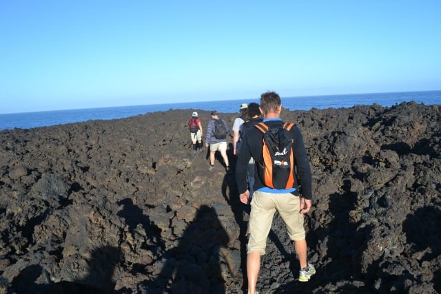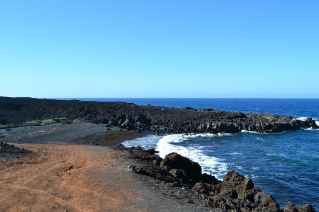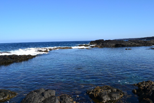 This red lava boulder has been lifted by the sea to place it on the cliff top, it’s the only rock of it’s kind in that area. All we could see looking ahead and behind us was black lava rock and the blue of the sky and sea.