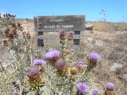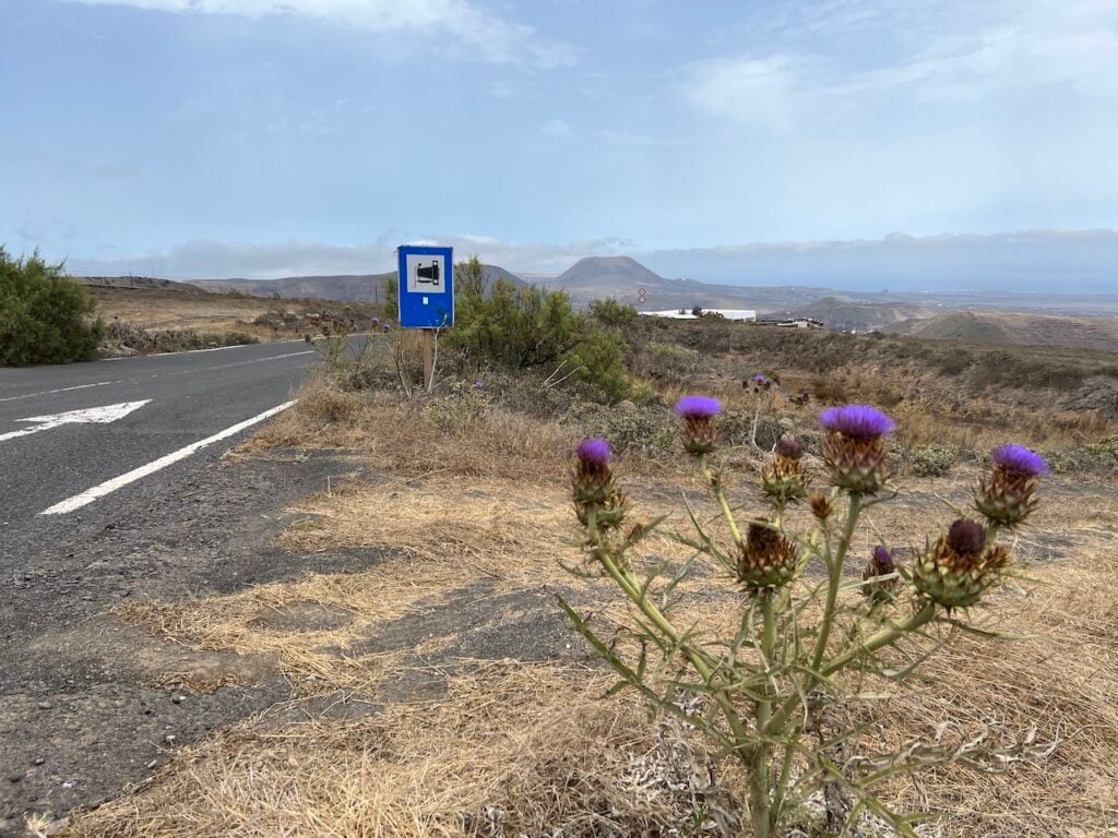 If you walk to the right following the paved road you will see some of the experimental fenced off areas where local species of plants have been re-introduced to try and stop the soil erosion. Eventually you can find a cross with a view down to Haría.
