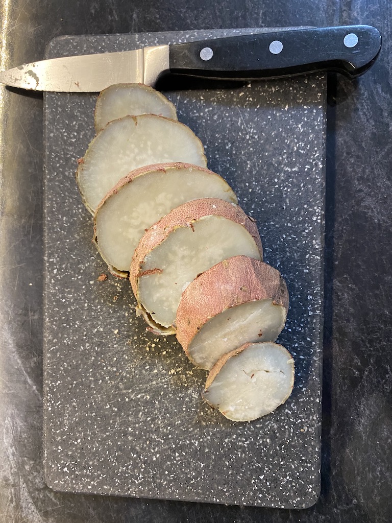 According to my local food snout. There are 3 main types of batata grown on the island and they vary in colour and ugliness. When cut, they instantly display oxidant damage, which sprinkles their pretty pink or white flesh with brown marks. Another ugly factor in their disfavour. The way to stop this, is to peel them, and immediately place them into a bowl of salted water. Before use, drain and place on paper towels to soak up any moisture.