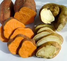 Some people call sweet potatoes, yams. Apart from their ugliness, there are few similarities. Yams are tubers, whilst sweet potatoes have storage roots. Sweet potatoes are sort of smooth and thin skinned, yams are very rough and scaly. Technically yams aren’t in the same family as the sweet potato. Sweet potatoes belong to the morning glory family, yams belong to Discoreaceae family. Yams originate in West Africa and sweet potatoes from Central America. That’s the headmistress stuff over with. Really, the only similarity is that they are both really ugly.