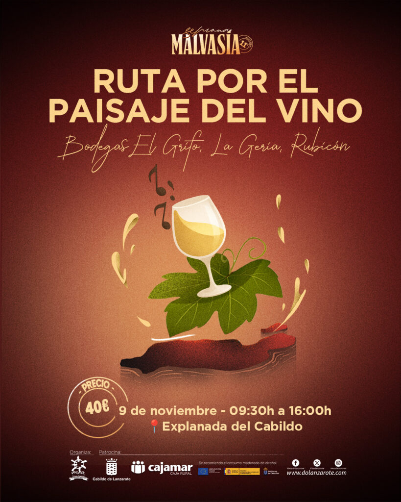 Spectacular finale of the Malvasía Week with a tour of three of Lanzarote’s wine temples: Bodegas El Grifo, La Geria and Rubicón. A journey through the most unique volcanic landscape in the Canary Islands. Departing the Cabildo esplanade where you’ll be taken back to at the end. The grand finale awaits you at Bodegas Rubicón: a memorable toast accompanied by a snack in a unique setting that will make this day an experience to remember.