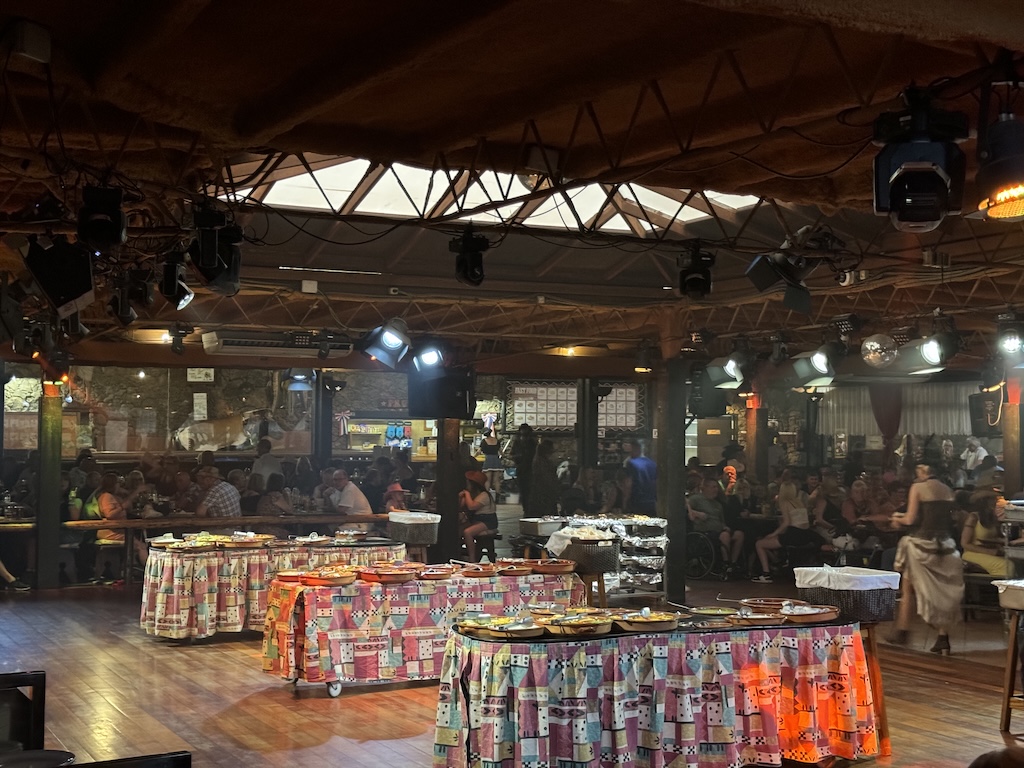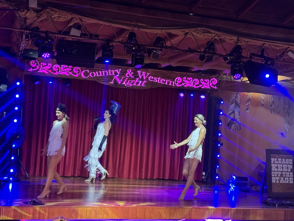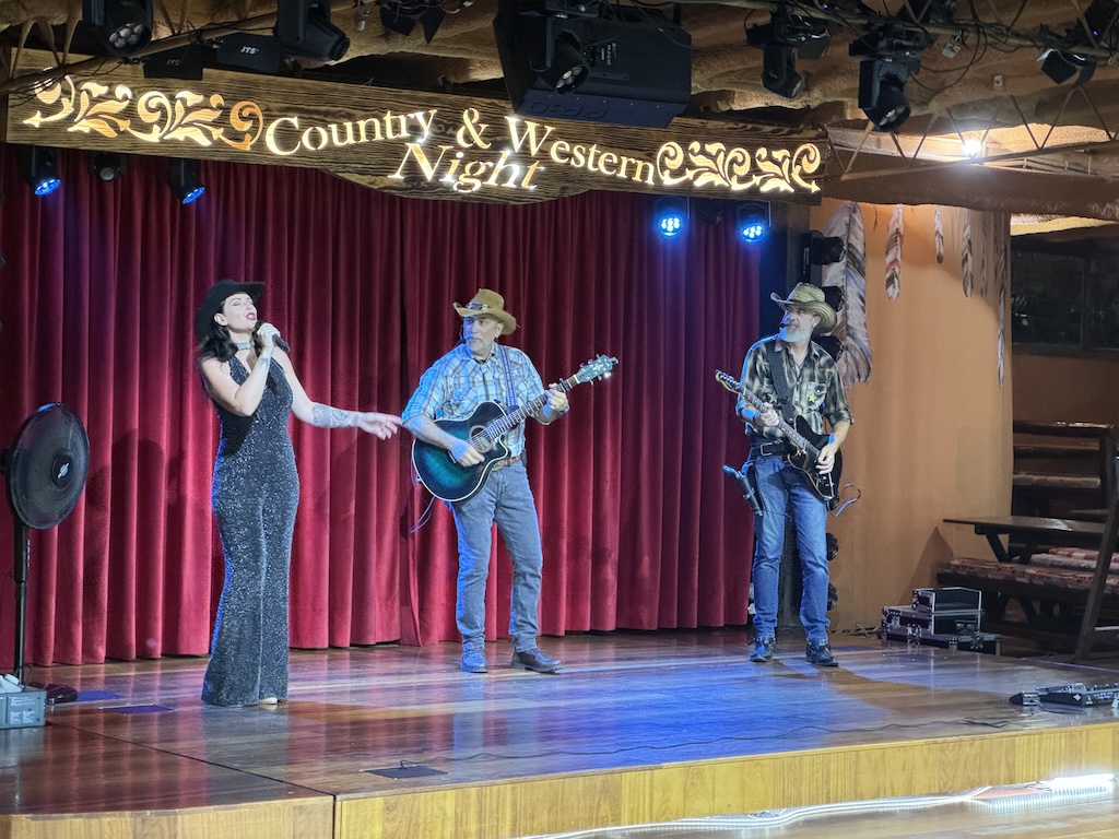 The lighting and sound system are absolutely superb, and the performance starts very soon after everyone has had drinks served. My only complaint was that it was very hot in the venue, despite large air conditioners dotted around the place. Calamity Jane explained how the evening was going to work, and then the music started with the show band playing a few numbers, and being joined by various cast members who performed for us. The entertainment was genuinely good, with dancers, a stunning fire performance, rope swinging and bull whip cracking, all interspersed with great music, sung well. The singers, dancers and musicians are all very good at their craft.